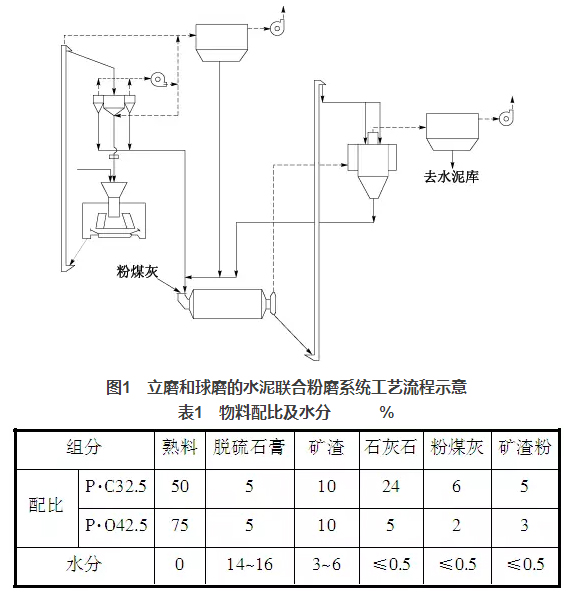 淶水冀東水泥有限公司3個水泥粉磨系統均采用JLMS-24.3立磨與Φ4.8m×9.5m球磨機組成聯合粉磨系統。JLMS-24.3立磨裝機功率2240kW,磨盤中徑2400mm,3個磨輥,磨盤轉速33.58r/min,產量210t/h,入料粒度≤30mm;配套選粉機JXF4100GY,成品量180~220t/h,比表面積≥200m2/kg,最大喂料量600t/h,通過氣體溫度≤150℃,通風量(70~90℃)180000m3/h;球磨機Φ4.8m×9.5m,裝機功率3550kW,產量180t/h,生產P·O42.5水泥時,比表面積360~380 m2/kg;配套O-Sepa選粉機,通風量240000m3/h,最大通過量720t/h。水泥粉磨系統工藝流程見圖1,系統設計指標:生產P·O42.5水泥,臺時產量180t/h,分步電耗35.5kWh/t,比表面積360m2/kg,生產P·C32.5水泥,臺時產量240t/h,分步電耗26.6kWh/t,比表面積370m2/kg。物料配比及相應的水分情況見表1。