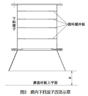 一方面它降低了入磨物料高落差對溜子的沖刷,另一方面圓環的收口作用使得物料的下料點發生了變化,將原先的單點偏心下料改成接近中心下料,改善了物料在磨盤上的偏離現象。同時,適當調整h值的大小(原設計600mm,最終改為400mm),使得下料波動時,可以起到一定的緩沖作用,穩定料床。