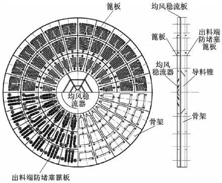 該隔倉板是在進料端篦板與隔倉板骨架間設置均風穩流板和均風穩流器,這樣在磨機中通過隔倉板的物料量大量增加的情況下,前后隔倉板的物料流速達到均衡,利于保持合理的球料比。在骨架中導料錐的作用下,物料沿導料錐隨磨機的旋轉以遠低于風速的速度流入后倉,消除隔倉板附近的“低效研磨區”。