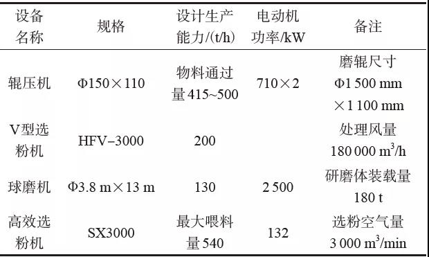 1 試驗粉磨系統基本情況主要設備配置及性能見表1,物料配比及細度指標見表2。