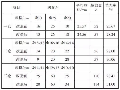 表2 改造前后磨內研磨體級配情況