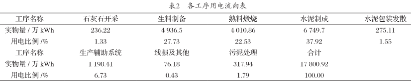 水泥企業(yè)電力消耗主要是設(shè)備動(dòng)力拖動(dòng),一部分由社會(huì)電網(wǎng)提供,另外一部分由企業(yè)余熱發(fā)電廠提供。2018年企業(yè)外購(gòu)電力13 688.15 萬(wàn)kWh,余熱自發(fā)電4 112.77 萬(wàn)kWh,合計(jì)17 800.92 萬(wàn)kWh全部用于水泥生產(chǎn)。各工序用電流向如表2所示。