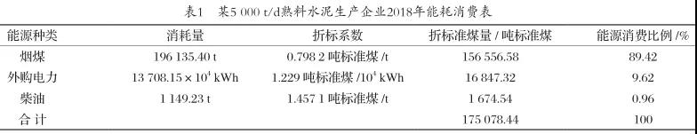 某水泥企業(yè),現(xiàn)有1條5000t/d新型干法水泥回轉(zhuǎn)窯生產(chǎn)線以及2臺(tái)180t/h水泥磨,具有年產(chǎn)普通硅酸鹽水泥熟料150萬(wàn)t和年產(chǎn)硅酸鹽水泥160萬(wàn)t的生產(chǎn)能力。主要產(chǎn)品為PO42.5和PS32.5A水泥。主要消耗的能源為煙煤、電力、柴油等。主要生產(chǎn)工序包括石灰石礦山開采、生料制備、熟料煅燒、水泥制成。2018年該企業(yè)綜合能耗為175078.44噸標(biāo)準(zhǔn)煤。主要能源消費(fèi)情況如表1所示。