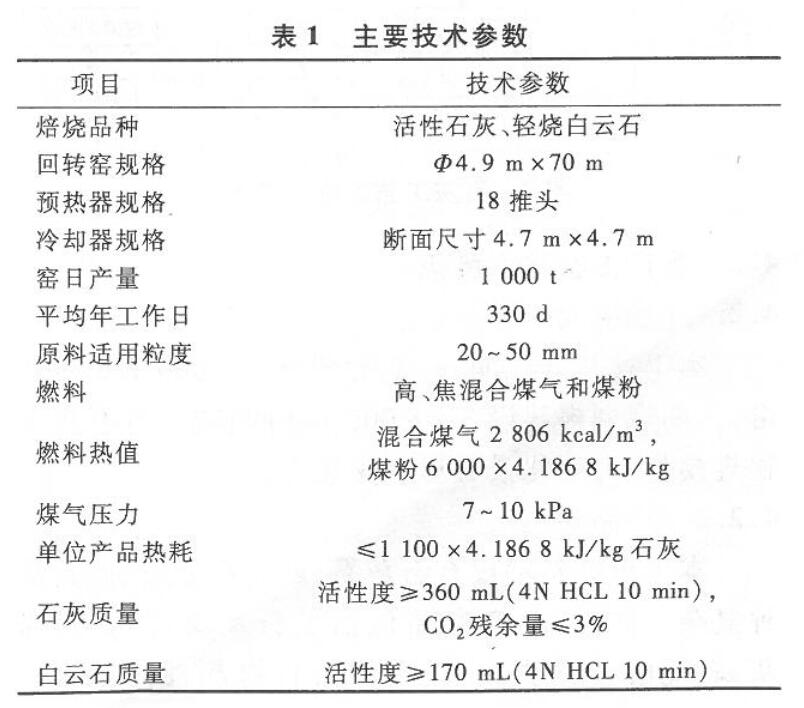 石灰石/白云石進(jìn)人預(yù)熱器后經(jīng)窯尾約1100 ℃的煙氣預(yù)熱,其中一部分石灰石/白云石在預(yù)熱器中分解。預(yù)熱的物料由液壓推桿推出,經(jīng)轉(zhuǎn)運(yùn)溜槽進(jìn)入回轉(zhuǎn)窯中,物料在回轉(zhuǎn)窯內(nèi)經(jīng)過焙燒分解,焙燒好的石灰/白云石進(jìn)入豎式冷卻器,由底部送入的冷空氣冷卻后通過振動(dòng)給料機(jī)排至集料斗,再經(jīng)成品鏈斗機(jī)送往成品系統(tǒng)。冷空氣在冷卻器內(nèi)冷卻物料的同時(shí)被加熱,經(jīng)窯頭罩進(jìn)入窯內(nèi),作為燃料燃燒的二次空氣參與燃燒。回轉(zhuǎn)窯所用燃料經(jīng)由煤氣和煤粉管道分別送至回轉(zhuǎn)窯窯頭廠房,通過燒嘴從窯頭進(jìn)入回轉(zhuǎn)窯內(nèi)燃燒。燃料燃燒產(chǎn)生的熱煙氣在焙燒和加熱物料后與物料分解產(chǎn)生的廢氣一起從窯尾排出,經(jīng)轉(zhuǎn)運(yùn)溜槽進(jìn)入預(yù)熱器中預(yù)熱石灰石/白云石。預(yù)熱石灰石/白云石后的煙氣從預(yù)熱器排出,經(jīng)過除塵器除塵后由排煙機(jī)排入大氣。主要技術(shù)參數(shù)列于表1。