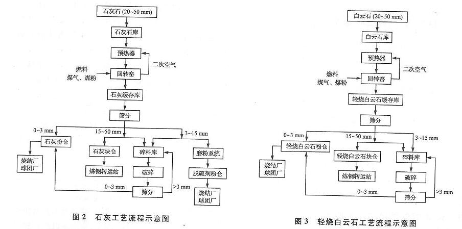 石灰工藝流程及輕燒白云石工藝流程詳見圖2和圖3。